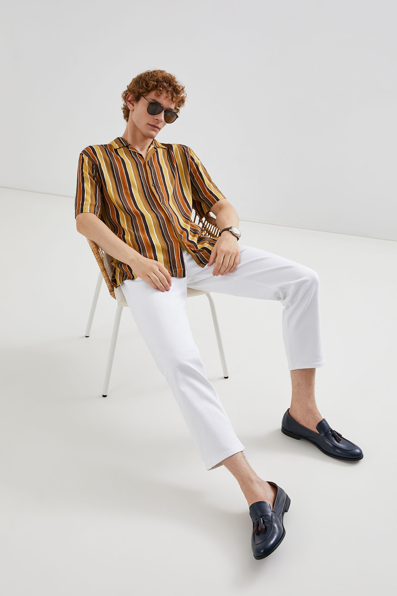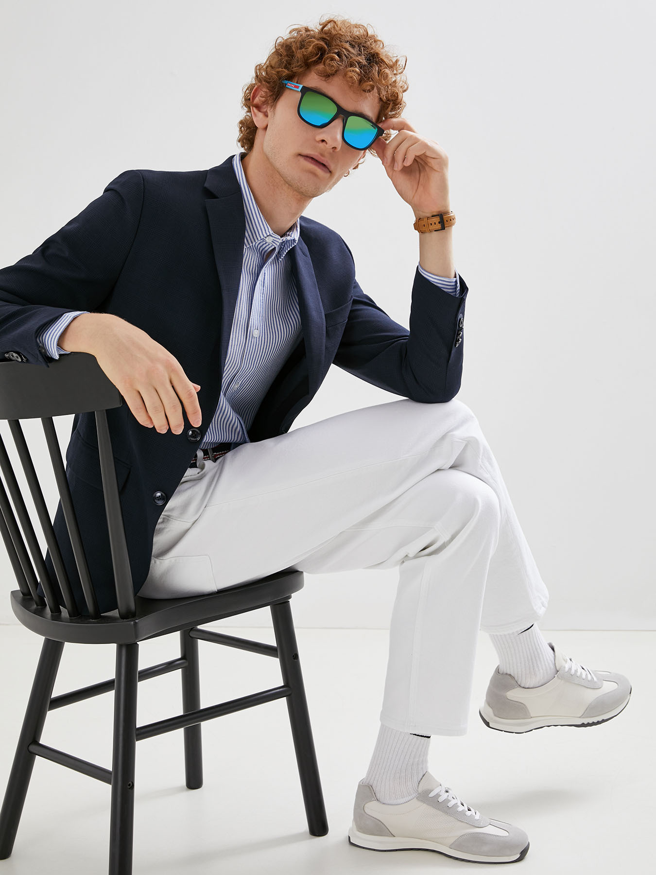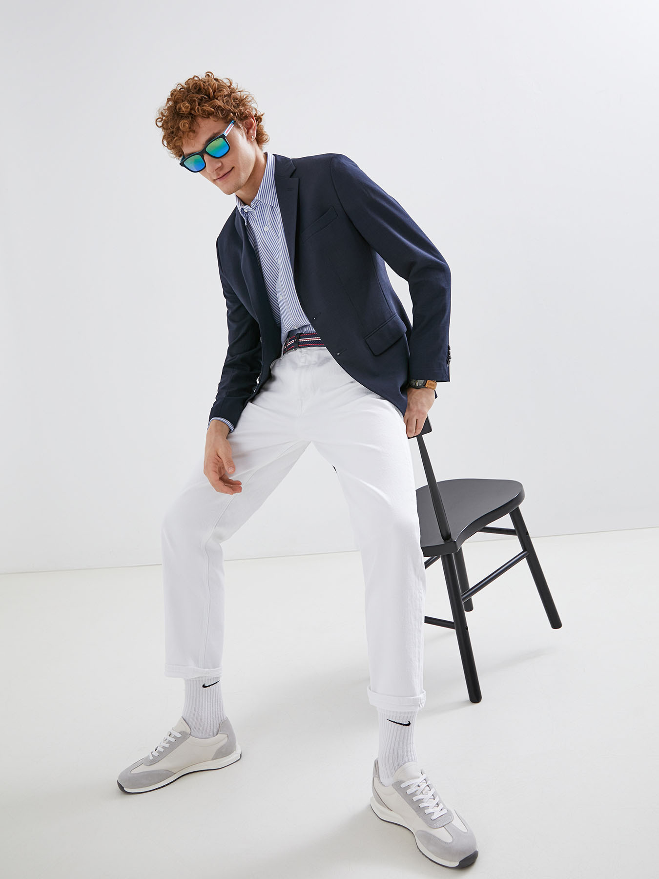 Образ для отпуска на Ривьере или Черноморского побережья — как вам больше нравится. К брюкам добавляем легкий пиджак без подкладки — в нем будет комфортно даже в жару. Делаем ставку на аксессуары в стиле ретро: плетеный ремень, лоферы и очки.