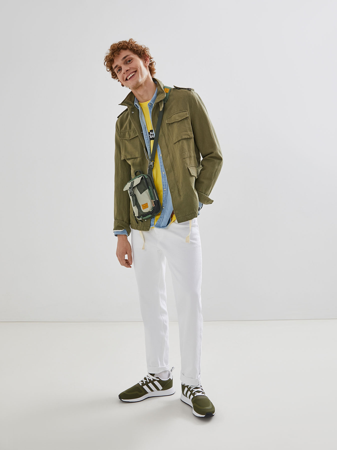 Играем на контрастах: к белым джинсам — ветровку в стиле милитари. К такому комплекту отлично подойдет одежда из фактурных материалов: рубашка из шамбре или фактурного хлопка. А еще кроссовки и хлопковая сумка.