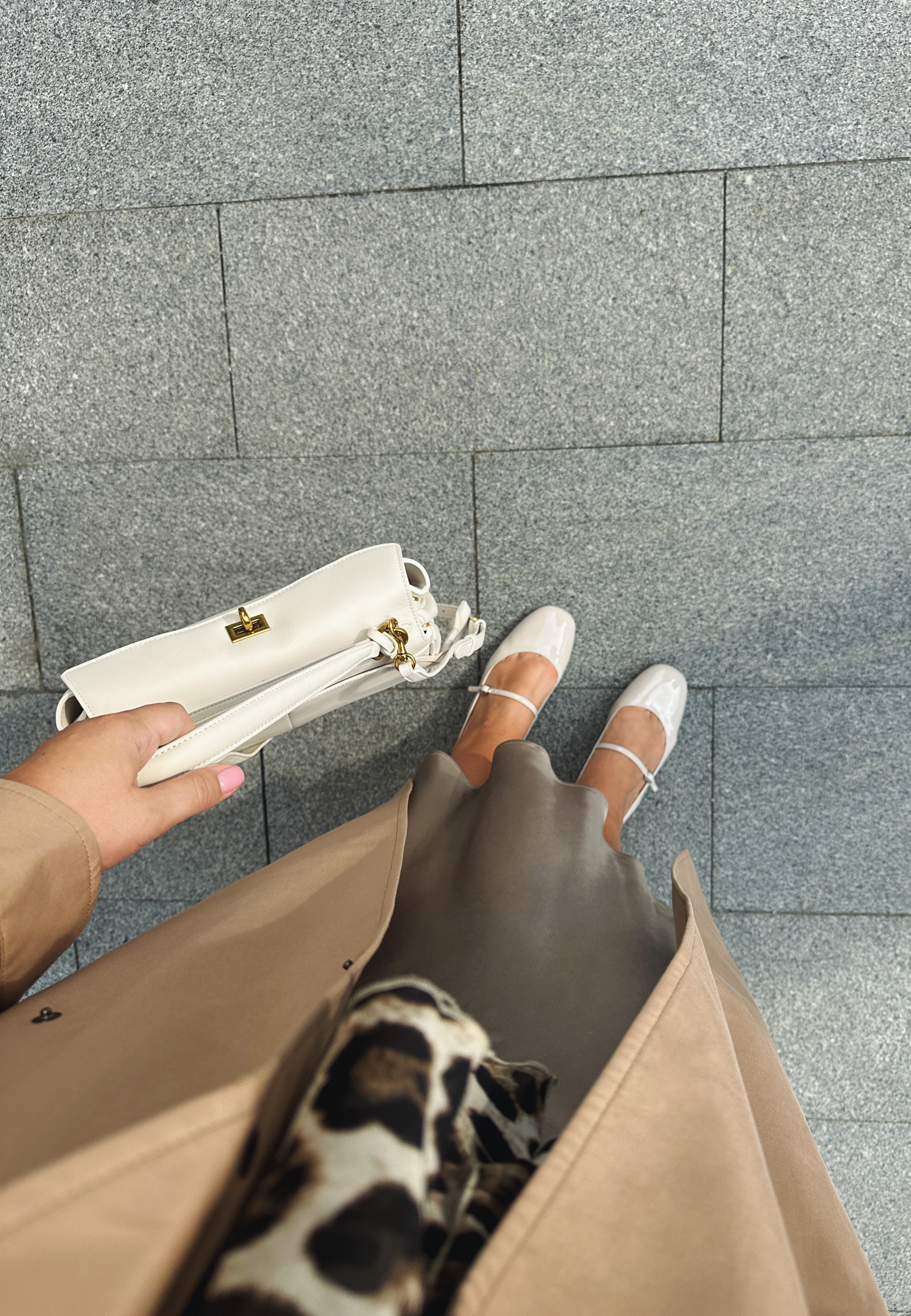 Блеск сатиновой юбки, бант на блузе, ремешки на туфлях — как успокоить эффектные модели с заявкой на вечерние? Добавить к ним самый базовый бежевый тренч с минимумом деталей.