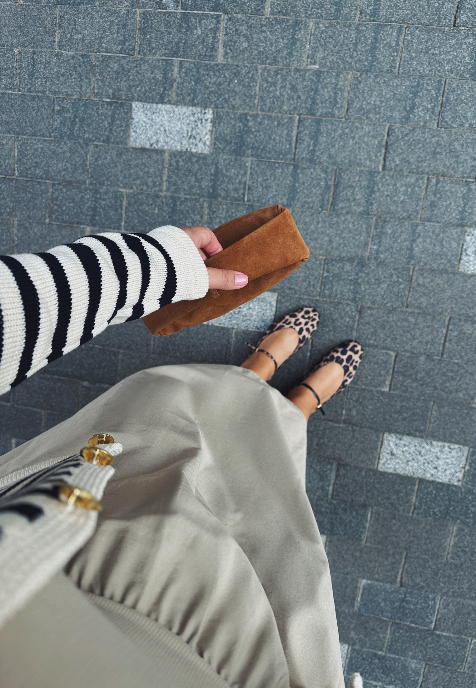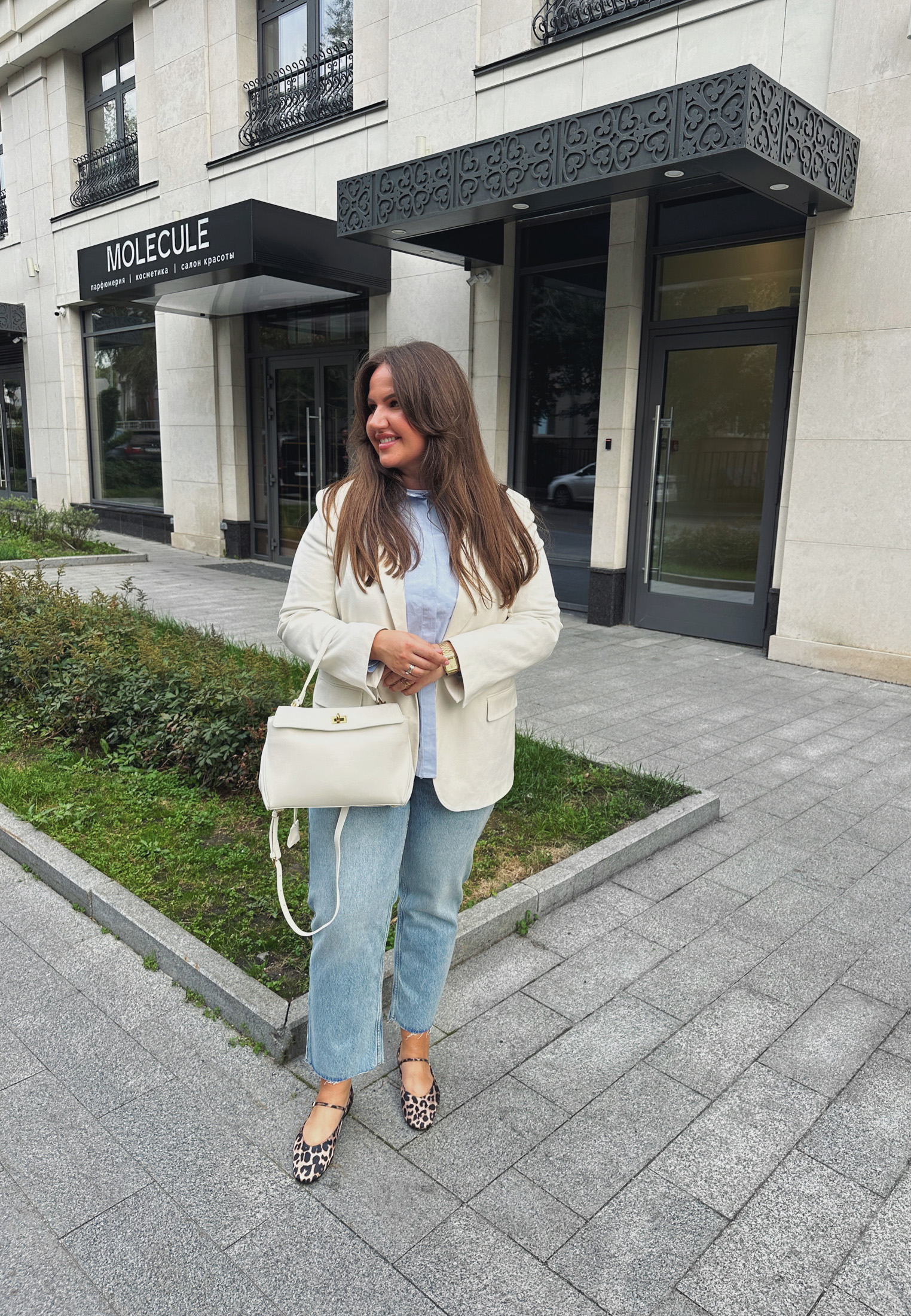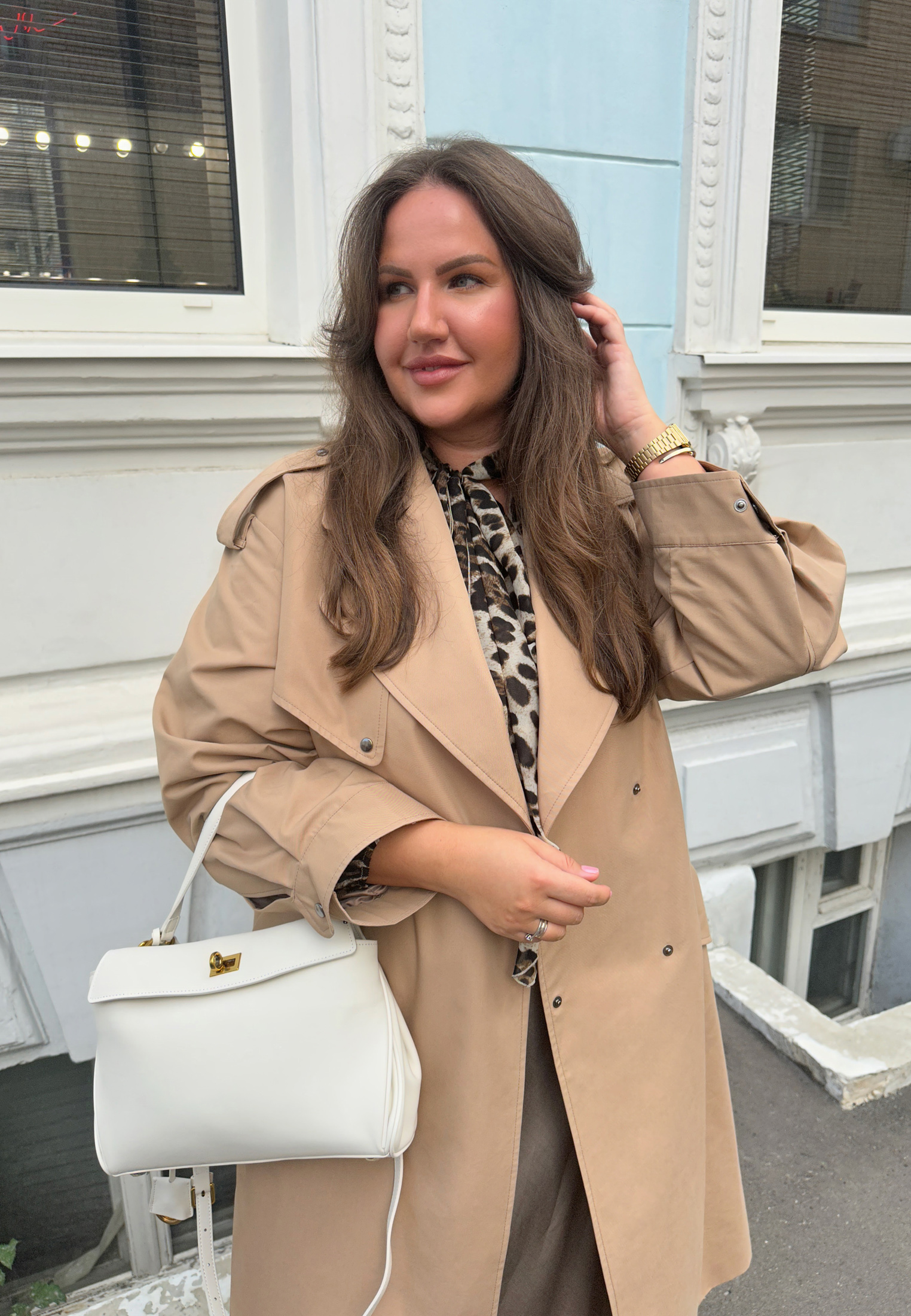 Думаете, что два рисунка сразу в образе — это не про элегантность? Мария доказывает обратное. Секрет в общей нейтральной гамме, которая делает полоску и леопард более классическими и универсальными, а также в лаконичном крое вещей.