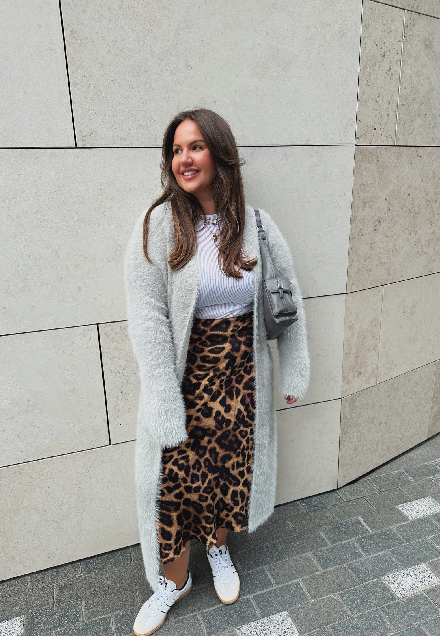 Если вы решились на яркую леопардовую вещь, то остальную одежду выбирайте спокойных оттенков. Лайфхак от Марии, чтобы юбка с принтом не утяжеляла низ: наденьте удлиненный кардиган, который создаст в силуэте вертикальные линии и визуально вытянет фигуру.