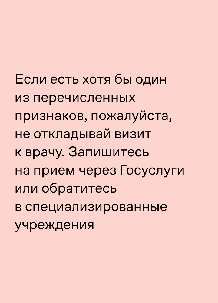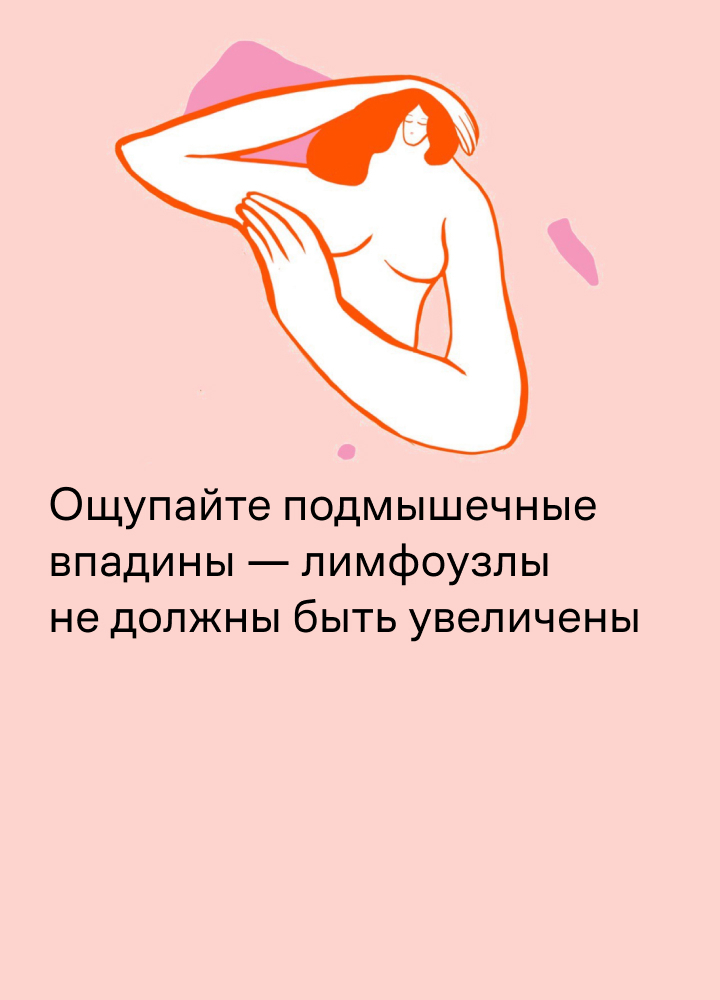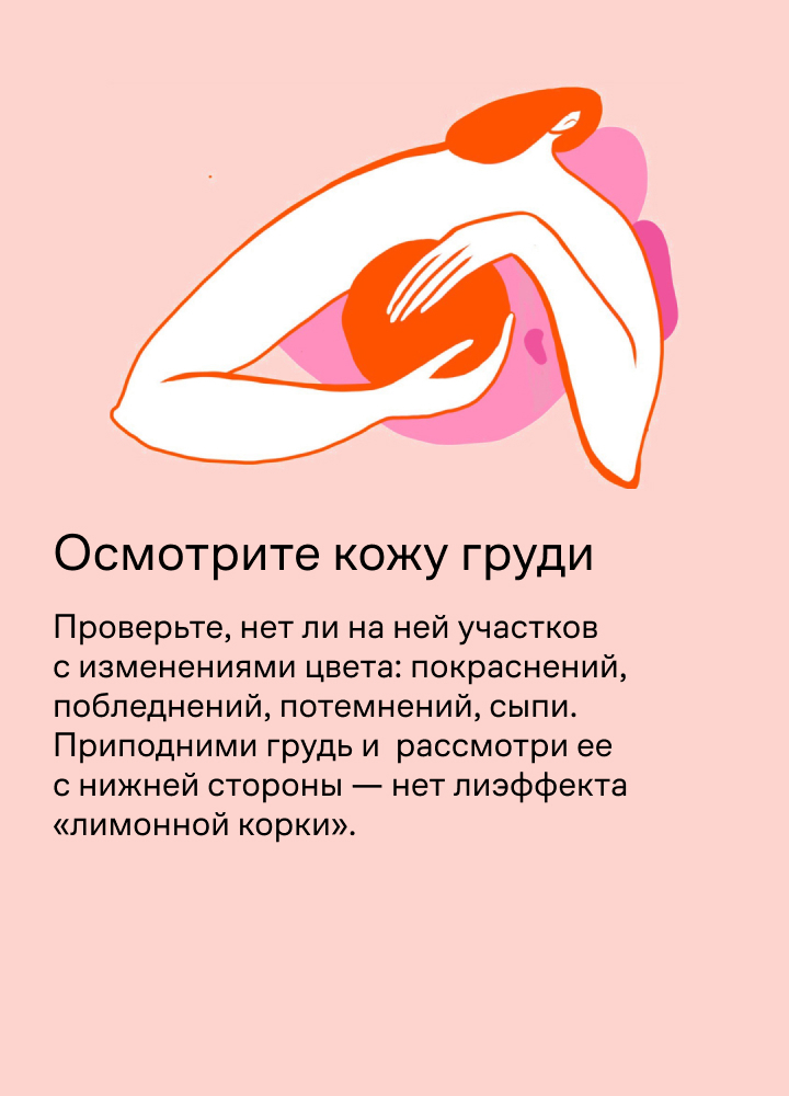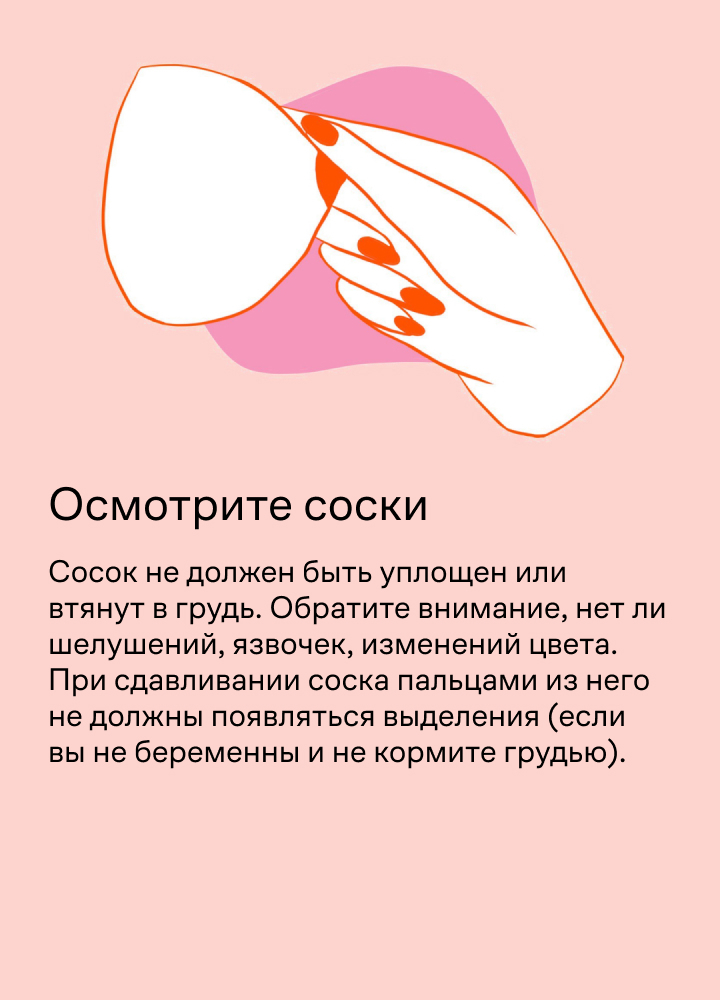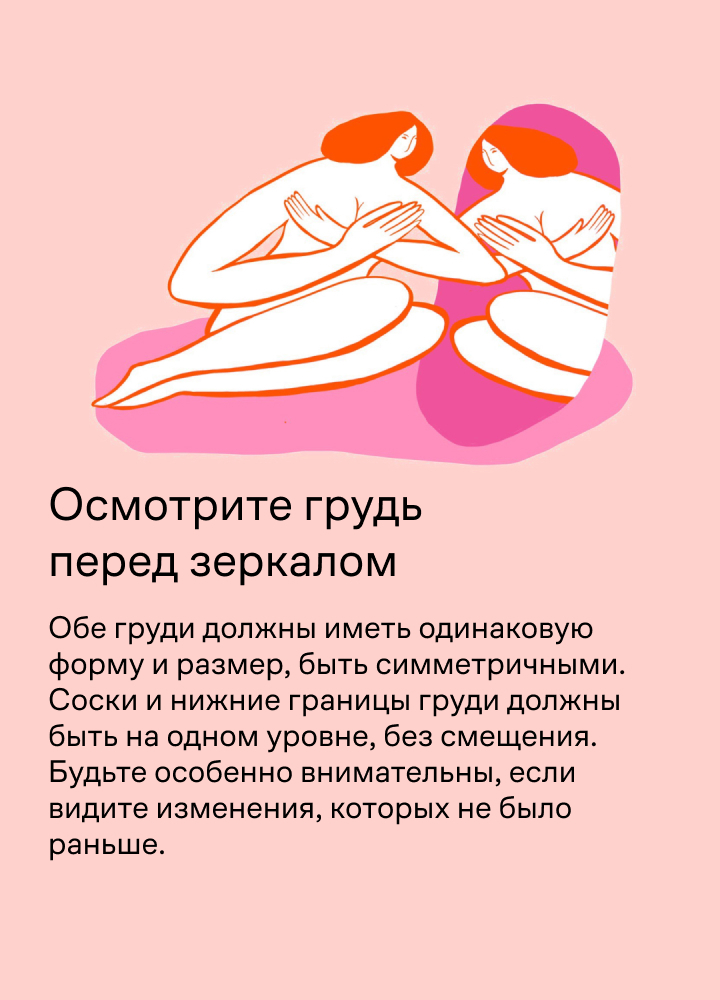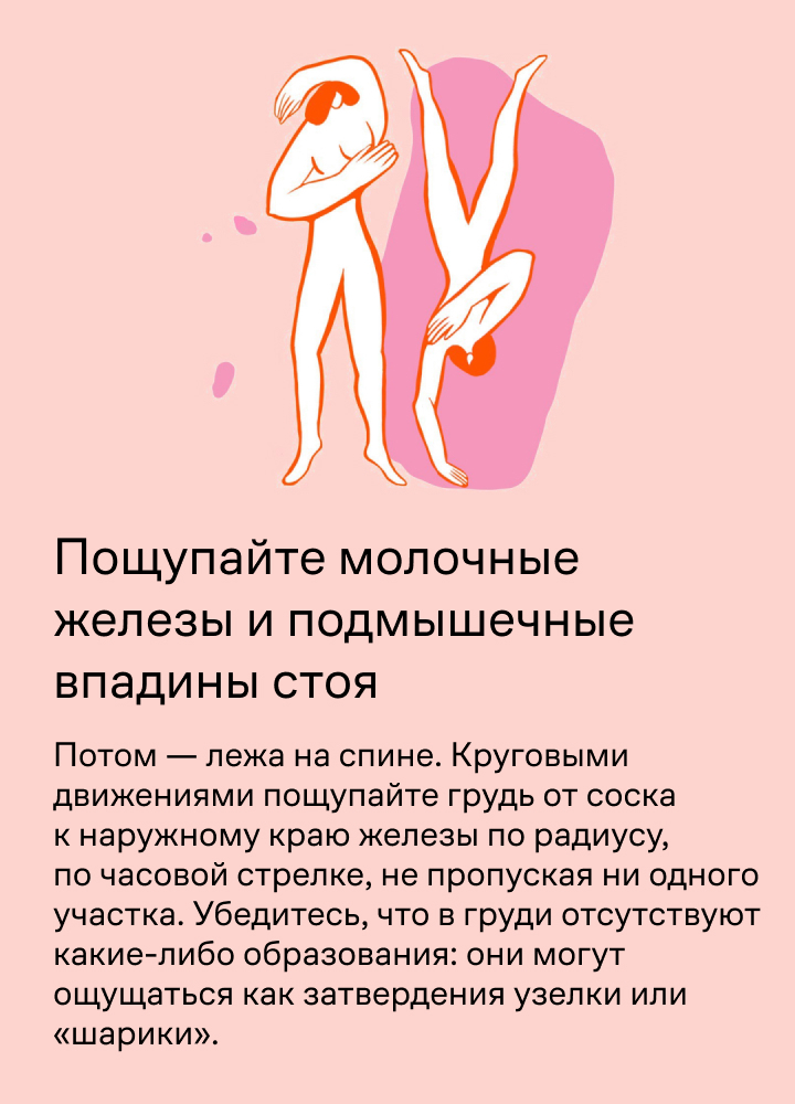 Так вы сможете заметить первые симптомы и вовремя обратиться к врачу: рак груди легче вылечить на ранней стадии. Осмотр рекомендуют делать на 5–6 день цикла.